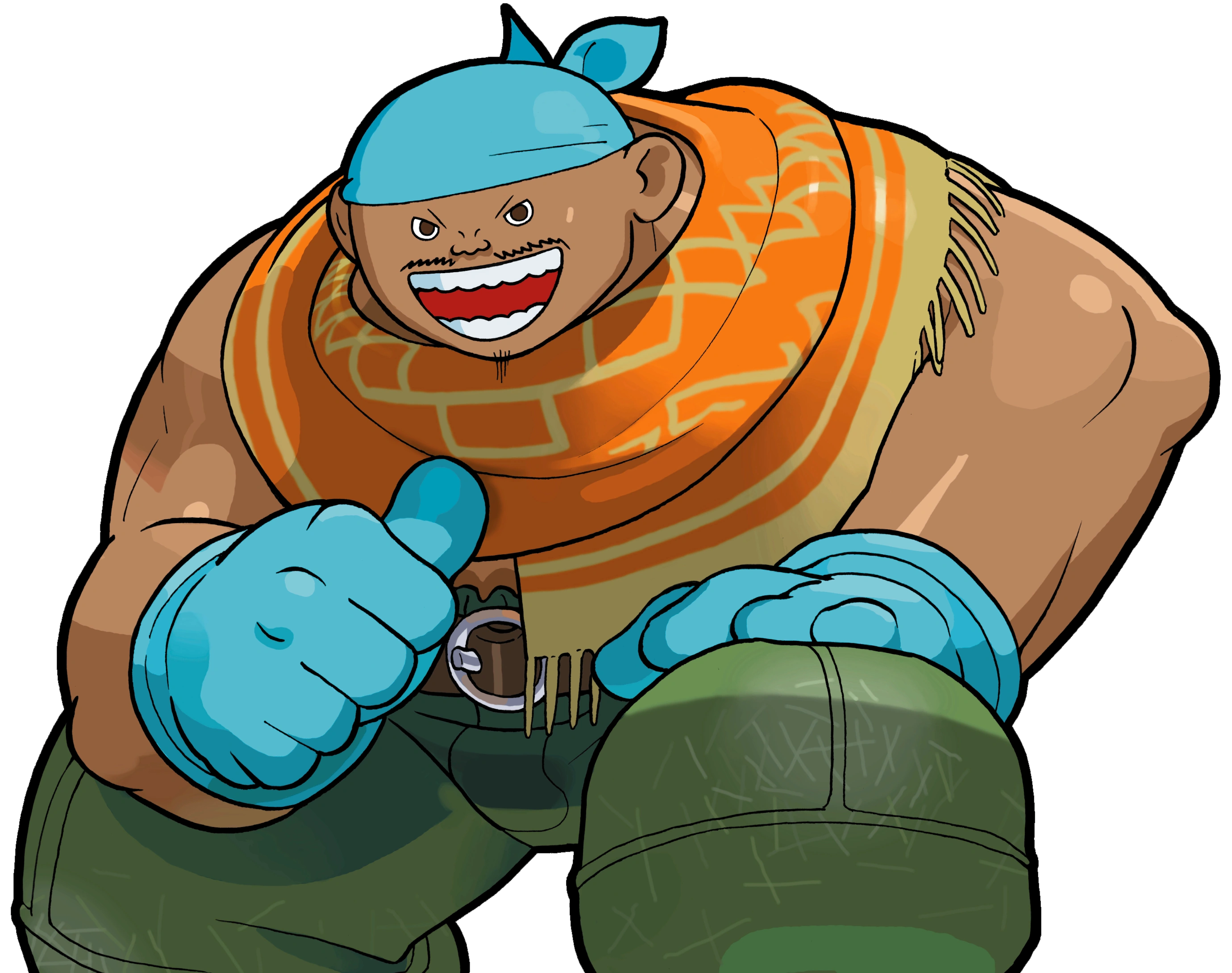 Gunrock is a powerful fighter with a huge built, and his immense strength and defense makes up for his low mobility. Thanks to his magnificent strength, he can throw objects better than any other fighter. In the anime, he demonstrates his brute strength when he wrecks the gambling hall.